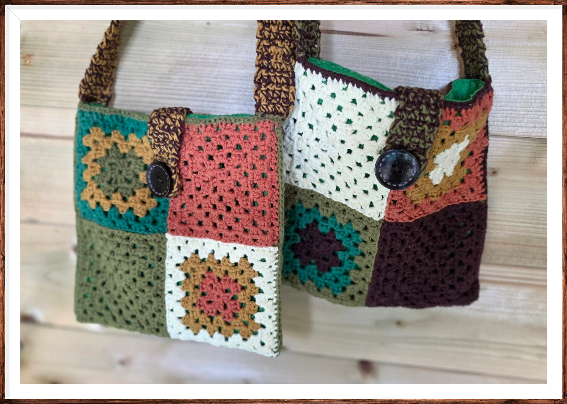 Hij is gemaakt in prachtige herfstkleuren, en gevoerd met een groene stof. De tas is voorzien van een knoopsluiting, en een extra lange schouderband om hem cross-body te kunnen dragen.