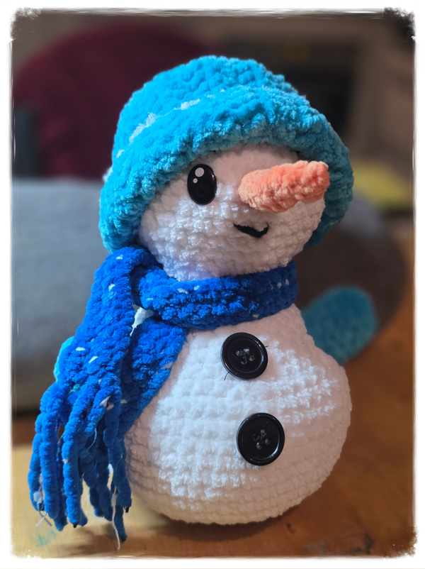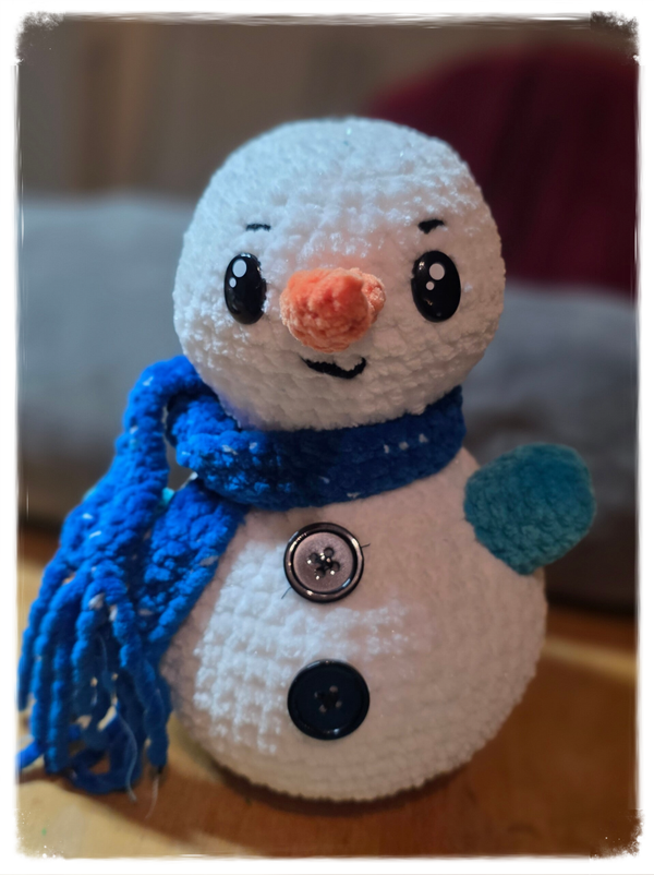 Deze leuke gehaakte sneeuwpop heeft het al behoorlijk koud, daarom kun je hem zijn sjaal en muts vast aandoen.