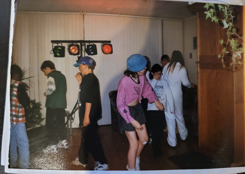 Een disco op die leeftijd is ook een heel ding natuurlijk. Ik was zelf volgens mij 11 jaar toen ik een discofeestje thuis vierde. Mijn ouders hadden een paar grote lampen gehuurd (denk ik) en een stel oudere vrienden waren de DJ, met stroboscoop. Het is 1 van de verjaardagen die ik mij het beste kan herinneren. Hieronder zie je een foto van dat feestje, en ja die met dat gekke hoedje en roze opgeknoopte shirt ben ik, lekker charmant. Maar ja, in de jaren 90 kon alles toch?